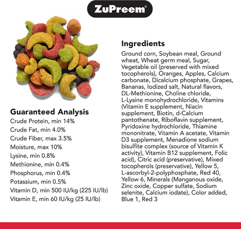 Ingredients Ground corn, Soybean meal, Ground wheat, Wheat germ meal, Sugar, Vegetable oil (preserved with mixed tocopherols), Oranges, Apples, Calcium carbonate, Dicalcium phosphate, Grapes, Bananas, Iodized salt, Natural flavors, DL-Methionine, Choline chloride, L-Lysine monohydrochloride, Vitamins (Vitamin E supplement, Niacin supplement, Biotin, d-Calcium pantothenate, Riboflavin supplement, Pyridoxine hydrochloride, Thiamine mononitrate, Vitamin A acetate, Vitamin D3 supplement, Menadione sodium bisulfite complex (source of Vitamin K activity), Vitamin B12 supplement, Folic acid), Citric acid (preservative), Mixed tocopherols (preservative), Yellow 5, L-ascorbyl-2-polyphosphate, Red 40, Yellow 6, Minerals (Manganous oxide, Zinc oxide, Copper sulfate, Sodium selenite, Calcium iodate), Color added, Blue 1, Red 3