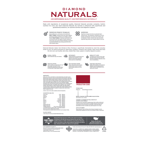 Diamond Naturals Indoor Cat is specifically formulated to meet the everyday needs of your cat while promoting an ideal body condition. Omega-6 and omega-3 fatty acids help keep the skin and coat healthy and shiny. Added fiber helps support a healthy digestive system. - Ideal for everyday feeding for adult cats - Real, fresh chicken for superior taste and nutrition - Omega-6 and omega-3 fatty acids for skin and coat - Helps control and reduce hairball formation - Enhanced with super foods and probiotics - No corn, no wheat, no soy