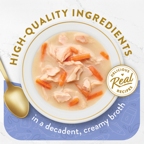 Fancy Feast Broths With Wild Salmon & Whitefish In A Decadent Creamy Broth Simplicity at its finest, this delicious, creamy broth is carefully crafted with tender pieces of wild salmon and whitefish to delight your cat. Lickable, lappable Fancy Feast Broths feature real, recognizable ingredients – never any by-products or fillers. These simply crafted, savory recipes are brimming with tastes and textures your cat will find irresistible. Does your cat enjoy Fancy Feast Broths? Choose from the entire menu of chicken and seafood recipes.