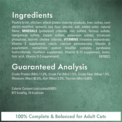 poultry broth, chicken, wheat gluten, liver, meat by-products, spinach, turkey, corn starch-modified, artificial and natural flavors, calcium phosphate, added color, salt, soy protein concentrate, potassium chloride, taurine, choline chloride, magnesium sulfate, thiamine mononitrate, vitamin e supplement, zinc sulfate, ferrous sulfate, niacin, calcium pantothenate, vitamin a supplement, menadione sodium bisulfite complex (source of vitamin k activity), copper sulfate, manganese sulfate, pyridoxine hydrochloride, riboflavin supplement, vitamin B-12 supplement, biotin, folic acid, vitamin D-3 supplement, potassium iodide