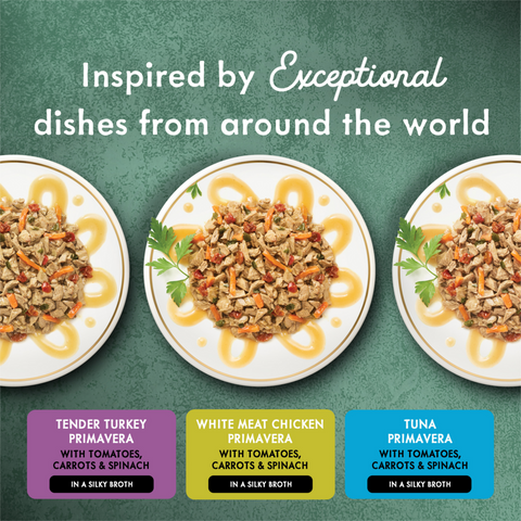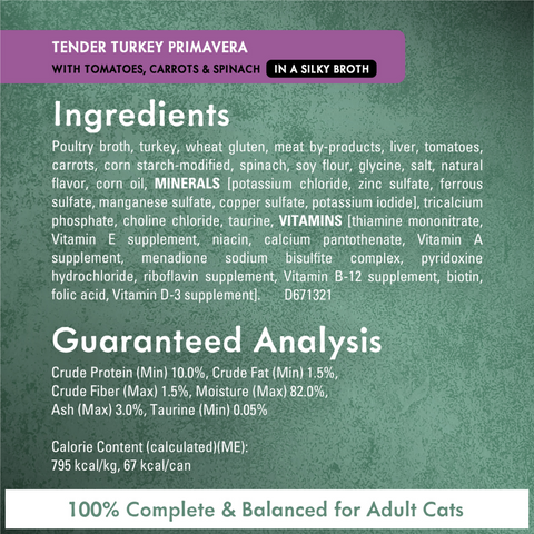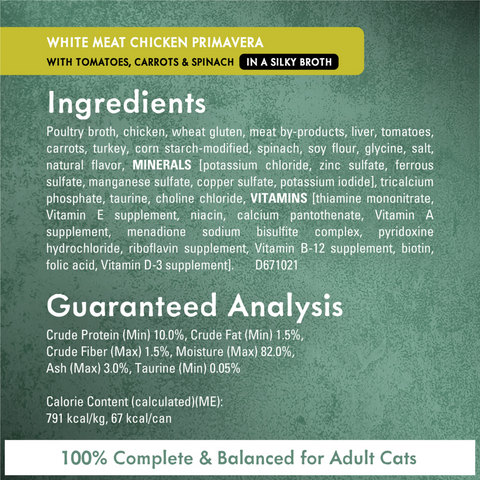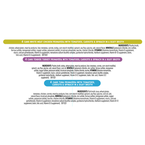 Ingredients Chicken Primavera:Poultry broth, chicken, wheat gluten, liver, tomatoes, meat by-products, carrots, spinach, turkey, corn starch-modified, artificial and natural flavors, calcium phosphate, salt, added color, soy protein concentrate, potassium chloride, taurine, choline chloride, magnesium sulfate, thiamine mononitrate, Vitamin E supplement, zinc sulfate, ferrous sulfate, niacin, calcium pantothenate, Vitamin A supplement, menadione sodium bisulfite complex (source of Vitamin K activity), copper sulfate, manganese sulfate, pyridoxine hydrochloride, riboflavin supplement, Vitamin B-12 supplement, biotin, folic acid, Vitamin D-3 supplement, potassium iodide.Whitefin Tuna Primavera:Fish broth, yellowfin tuna, wheat gluten, chicken, tomatoes, carrots, liver, spinach, meat by-products, corn starch-modified, artificial and natural flavors, salt, calcium phosphate, corn oil, soy protein concentrate, added color (Red 3 and other color), potassium chloride, taurine, choline chloride, thiamine mononitrate, Vitamin E supplement, zinc sulfate, niacin, ferrous sulfate, calcium pantothenate, Vitamin A supplement, menadione sodium bisulfite complex (source of Vitamin K activity), pyridoxine hydrochloride, manganese sulfate, riboflavin supplement, copper sulfate, Vitamin B-12 supplement, biotin, folic acid, Vitamin D-3 supplement, potassium iodide.Turkey Primavera:Poultry broth, turkey, liver, wheat gluten, tomatoes, carrots, spinach, meat by-products, corn starch-modified, artificial and natural flavors, salt, calcium phosphate, soy protein concentrate, added color, potassium chloride, taurine, choline chloride, magnesium sulfate, thiamine mononitrate, Vitamin E supplement, zinc sulfate, niacin, ferrous sulfate, calcium pantothenate, Vitamin A supplement, menadione sodium bisulfite complex (source of Vitamin K activity), copper sulfate, pyridoxine hydrochloride, manganese sulfate, riboflavin supplement, Vitamin B-12 supplement, biotin, folic acid, Vitamin D-3 supplement, potassium iodide.