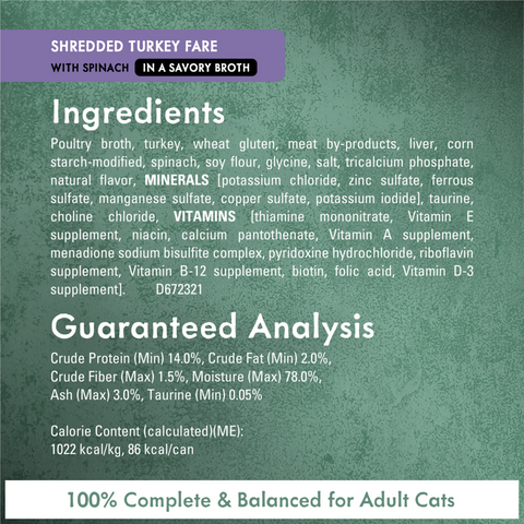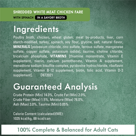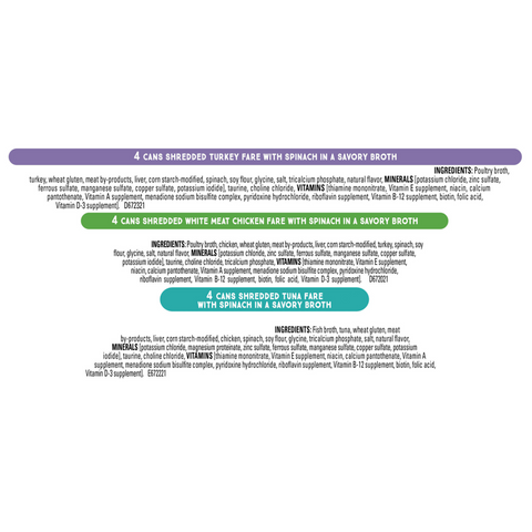 Ingredients Turkey Ingredients:Poultry broth, turkey, wheat gluten, liver, meat by-products, spinach, corn starch-modified, artificial and natural flavors, calcium phosphate, soy protein concentrate, salt, added color, potassium chloride, taurine, choline chloride, magnesium sulfate, thiamine mononitrate, Vitamin E supplement, zinc sulfate, ferrous sulfate, niacin, calcium pantothenate, Vitamin A supplement, menadione sodium bisulfite complex (source of Vitamin K activity), copper sulfate, manganese sulfate, pyridoxine hydrochloride, riboflavin supplement, Vitamin B-12 supplement, biotin, folic acid, Vitamin D-3 supplement, potassium iodide. Chicken Ingredients:Poultry broth, chicken, wheat gluten, liver, meat by-products, spinach, turkey, corn starch-modified, artificial and natural flavors, calcium phosphate, salt, added color, soy protein concentrate, potassium chloride, taurine, choline chloride, magnesium sulfate, thiamine mononitrate, Vitamin E supplement, zinc sulfate, ferrous sulfate, niacin, calcium pantothenate, Vitamin A supplement, menadione sodium bisulfite complex (source of Vitamin K activity), copper sulfate, manganese sulfate, pyridoxine hydrochloride, riboflavin supplement, Vitamin B-12 supplement, biotin, folic acid, Vitamin D-3 supplement, potassium iodide.Tuna Ingredients:Fish broth, tuna, wheat gluten, liver, meat by-products, chicken, spinach, corn starch-modified, artificial and natural flavors, calcium phosphate, salt, soy protein concentrate, added color (Red 3 and other color), potassium chloride, taurine, choline chloride, Vitamin E supplement, zinc sulfate, thiamine mononitrate, Vitamin A supplement, ferrous sulfate, manganese sulfate, pyridoxine hydrochloride, niacin, Vitamin B-12 supplement, riboflavin supplement, calcium pantothenate, copper sulfate, menadione sodium bisulfite complex (source of Vitamin K activity), Vitamin D-3 supplement, folic acid, potassium iodide, biotin.
