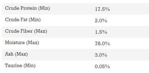 OCEAN FISH, FISH BROTH, SHRIMP, TRICALCIUM PHOSPHATE, VEGETABLE OIL, GUAR GUM, VITAMIN SUPPLEMENTS (E, A, D3), SODIUM NITRITE (TO PROMOTE COLOR RETENTION), ZINC SULFATE, THIAMIN HYDROCHLORIDE (VITAMIN B1), MANGANESE SULFATE, RIBOFLAVIN SUPPLEMENT.