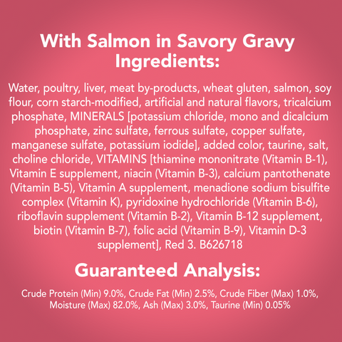 Water Sufficient for Processing, Poultry, Liver, Meat By-Products, Wheat Gluten, Salmon, Soy Flour, Corn Starch-Modified, Artificial and Natural Flavors, Tricalcium Phosphate, Potassium Chloride, Added Color, Taurine, Salt, Choline Chloride, Mono and Dicalcium Phosphate, Red 3, Thiamine Mononitrate, Zinc Sulfate, Vitamin E Supplement, Ferrous Sulfate, Niacin, Copper Sulfate, Calcium Pantothenate, Manganese Sulfate, Vitamin A Supplement, Menadione Sodium Bisulfite Complex (Vitamin K), Pyridoxine Hydrochloride, Riboflavin Supplement, Vitamin B-12 Supplement, Biotin, Folic Acid, Vitamin D-3 Supplement, Potassium Iodide. A-6267.