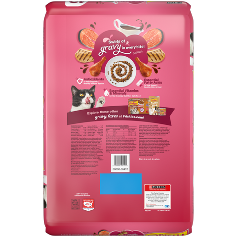 Bring the deliciousness of gravy mixed with two cat-favorite flavors to your cat's dish with Purina Friskies Gravy Swirlers dry cat food. Savory chicken and salmon flavors combine to create the taste cats crave, and there's gravy baked into each bite for added yum. Let the sound of the mouthwatering kibble hitting her bowl pique your cat's attention, and watch as she delights in every last delicious bite. This dry cat food recipe features essential vitamins and minerals for the everyday nutrition your cat needs to be her best self. Because it's formulated for all life stages, this mouthwatering meal can follow your cat companion from her playful kitten days all the way through to her adventurous adult years. Give your cat the 100% complete and balanced nutrition she deserves along with the taste she adores every time you offer up a helping of this Purina Friskies recipe.Serve up the flavors your cat loves with a delicious gravy twist when you offer up Purina Friskies Gravy Swirlers dry cat food. The taste of delicious gravy brings added flavor to every bite, while the tempting texture invites her to nibble her way to the bottom of her bowl. With the delectable tastes of chicken and salmon in one recipe, this dry cat food gives your feline friend a meal she can't resist. This delicious and nutritious formula contains antioxidants to support her healthy immune system and essential fatty acids to support her healthy skin and coat, so she can be her best cat self throughout every stage of life. Offer this recipe at every feeding, or alternate between wet and dry entrees when you serve her selections from our complete line of Purina Friskies wet cat foods, including our Purina Friskies Gravy Pleasers wet cat food entrees. When it comes to feeding your cat, you want to know she's getting a high-quality meal that provides the 100% complete and balanced nutrition she needs. That's why we formulate our recipes to meet or exceed industry standards for pet food. We check this dry cat food throughout the manufacturing process to ensure safety and quality. We strive to make quality the top priority in every wet and dry cat food we produce, and we have over 90 years of experience pushing pet nutrition forward. At Purina, we also value sustainability as a core concept, and we see that commitment through by looking for responsibly sourced ingredients for our pet food formulas. The end result of all this hard work is a high-quality cat food you can be proud to serve to your feline friend. Give her the delicious tastes she demands when you fill her dish with Purina Friskies Gravy Swirlers dry cat food at feeding time.