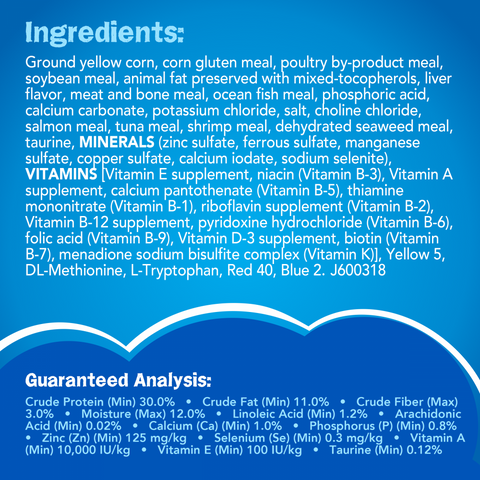 Ground Yellow Corn, Corn Gluten Meal, Poultry By-Product Meal, Soybean Meal, Animal Fat Preserved With Mixed-Tocopherols, Animal Liver Flavor, Meat And Bone Meal, Ocean Fish Meal, Calcium Carbonate, Phosphoric Acid, Salt, Potassium Chloride, Choline Chloride, Salmon Meal, Tuna Meal, Shrimp Meal, Crab Meal, Dehydrated Seaweed Meal, Added Color, Taurine, Zinc Sulfate, Vitamin E Supplement, Ferrous Sulfate, L-Tryptophan, Yellow 5, Manganese Sulfate, Red 40, Niacin, Blue 2, Yellow 6, Copper Sulfate, Vitamin A Supplement, Calcium Pantothenate, Thiamine Mononitrate, Riboflavin Supplement, Vitamin B-12 Supplement, Pyridoxine Hydrochloride, Folic Acid, Vitamin D-3 Supplement, Calcium Iodate, Biotin, Menadione Sodium Bisulfite Complex (Vitamin K), Sodium Selenite