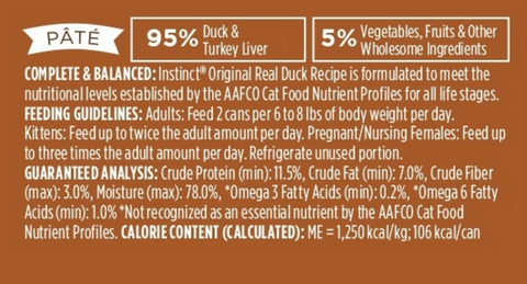 Satisfy your feline friend’s need for real food with Instinct Original Grain-Free Pate Real Duck Recipe Wet Canned Cat Food. This high animal protein, grain-free recipe is guided by Instinct’s belief in raw, and made especially for your cat to unlock her potential to thrive. It’s thoughtfully balanced with wholesome foods including real meat, fruits and vegetables in a delicious pate texture, along with natural sources of omega fatty acids to help promote a shiny coat and healthy skin.