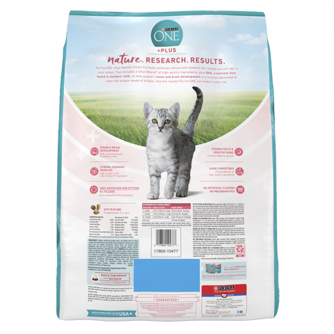 Give your growing kitten the nutrition she needs and a taste she loves when you serve Purina ONE Healthy Kitten Formula dry cat food. Real chicken as the first ingredient gives your budding feline the delectable taste cats love while providing her with the high-quality protein you demand from a veterinarian-recommended brand. This natural kitten formula plus essential nutrients is crafted with accents of real vegetables, including real carrots and peas, and without artificial flavors or preservatives. It's made with DHA, a nutrient found in mother's milk, which assists with brain and vision development. This formula also has an antioxidant-rich blend of vitamins E and A and other nutrients that help support a strong immune system. Your little friend is sure to love the enticing texture of the crunchy kibble, and you can feel good about giving her 100% complete and balanced nutrition for kittens to help support her overall health and wellness.Show your kitten just how much she means to you by filling her dish with Purina ONE Healthy Kitten Formula dry cat food. With 46 grams of protein per cup, this kitten food helps support her strong muscles, including a healthy heart. Kittens love the texture of this tasty recipe, which is crafted with real ingredients like real chicken, wholesome grains and accents of real vegetables. The crunchy kibble helps reduce plaque buildup and whiten teeth. Omega-6 fatty acids in every serving help give your kitten a radiant coat and healthy skin, and the formula is highly-digestible, so more nutrition goes to work inside your cat. Because it's made with 0% fillers, this dry kitten food ensures all of our high-quality ingredients have a purpose. Kittens generally nibble solid foods at three to four weeks of age. Keep moistened Purina ONE available to these kittens at all times. After weaning, at six to eight weeks of age, kittens normally eat dry or moistened food at will. Add variety to her diet with our menu of Purina ONE wet cat foods, including Purina ONE True Instinct Turkey Recipe in Gravy. Giving your cat the nutrition she needs to be happy and healthy is your first concern, and Purina ONE dry kitten food does just that. We craft this recipe in our U.S. facilities, so you know exactly where her meals are made. In a typical 24-hour production, Nestle Purina conducts 30,000 quality checks, so you know your precious kitten is getting the delicious and nutritious food she deserves. We formulate this Purina ONE recipe to meet or exceed all state and federal guidelines for pet food, and we put quality first in everything we do. Offer Purina ONE Healthy Kitten Formula dry cat food to your furry friend, and watch as she devours every last scrumptious bite.