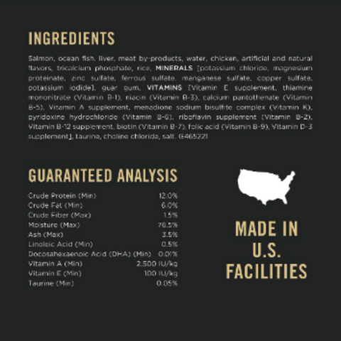 Salmon, ocean fish, liver, meat by-products, water sufficient for processing, chicken, artificial and natural flavors, brewers rice, tricalcium phosphate, guar gum, added color, potassium chloride, salt, choline chloride, taurine, Vitamin E supplement, zinc sulfate, calcium phosphate, thiamine mononitrate, ferrous sulfate, manganese sulfate, Vitamin A supplement, copper sulfate, pyridoxine hydrochloride, niacin, Vitamin B-12 supplement, riboflavin supplement, calcium pantothenate, menadione sodium bisulfite complex (source of Vitamin K activity), Vitamin D-3 supplement, folic acid, potassium iodide, biotin.
