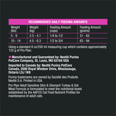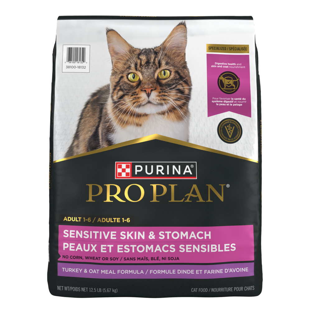 Fill your cat's bowl with the targeted nutrition in Purina Pro Plan Brand Cat Food Sensitive Skin and Stomach Natural Turkey and Oat Meal Formula With Added Vitamins, Minerals and Nutrients adult dry cat food. This SPECIALIZED recipe supports a cat's healthy skin, shiny coat and digestive health. This formula is high in protein to meet your cat's unique nutritional needs and features real turkey as the first ingredient. Rice and oat meal are included in this highly digestible formula, which is gentle on your cat's stomach. In addition, guaranteed live probiotics support her overall digestive and immune health, giving her a meal to help her thrive. Finally, this sensitive skin and stomach cat food is formulated without corn, wheat or soy and does not contain any artificial colors, flavors or preservatives, giving you added peace of mind. Help your cat live her best life when you feed her this natural formula with added vitamins, minerals and nutrients, which is designed especially for cats with sensitive skin and stomachs.