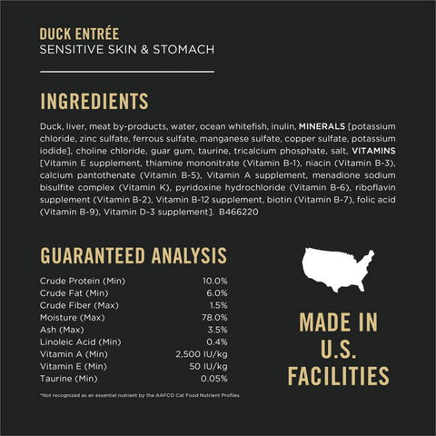 Arctic Char Entree: Arctic Char, Ocean Whitefish, Liver, Meat By-Products, Water Sufficient For Processing, Inulin, Essential Nutrients And Other Ingredients: Minerals (Potassium Chloride, Tricalcium Phosphate, Salt, Zinc Sulfate, Ferrous Sulfate, Manganese Sulfate, Copper Sulfate, Potassium Iodide), Vitamins (Choline, Vitamin E, Vitamin B-1, Vitamin B-3, Vitamin B-5, Vitamin A, Vitamin K, Vitamin B-6, Vitamin B-2, Vitamin B-12, Vitamin B-7, Folic Acid, Vitamin D-3), Guar Gum, Taurine. A466117; Duck Entree: Duck, Liver, Meat By-Products, Water Sufficient For Processing, Ocean Whitefish, Inulin, Essential Nutrients And Other Ingredients: Minerals (Potassium Chloride, Tricalcium Phosphate, Salt, Zinc Sulfate, Ferrous Sulfate, Manganese Sulfate, Copper Sulfate, Potassium Iodide), Vitamins (Choline, Vitamin E, Vitamin B-1, Vitamin B-3, Vitamin B-5, Vitamin A, Vitamin K, Vitamin B-6, Vitamin B-2, Vitamin B-12, Vitamin B-7, Folic Acid, Vitamin D-3), Guar Gum, Taurine. A466217