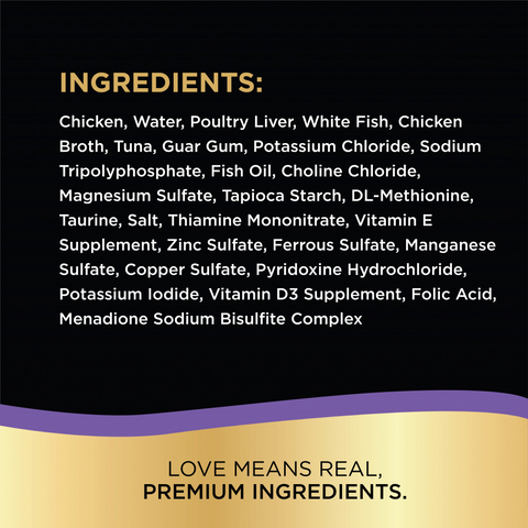 Chicken, Water, Poultry Liver, White Fish, Chicken Broth, Tuna, Guar Gum, Potassium Chloride, Sodium Tripolyphosphate, Fish Oil, Choline Chloride, Magnesium Sulfate, Tapioca Starch, DL-Methionine, Taurine, Salt, Thiamine Mononitrate, Vitamin E Supplement, Zinc Sulfate, Ferrous Sulfate, Manganese Sulfate, Copper Sulfate, Pyridoxine Hydrochloride, Potassium Iodide, Vitamin D3 Supplement, Folic Acid, Menadione Sodium Bisulfite Complex