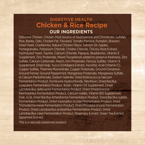 Deboned Chicken, Chicken Meal (source of Glucosamine and Chondroitin Sulfate), Rice, Barley, Oats, Chicken Fat, Flaxseed, Tomato Pomace, Pumpkin, Brewers Dried Yeast, Cranberries, Natural Chicken Flavor, Salmon Oil, Apples, Pomegranates, Potassium Chloride, Choline Chloride, Chicory Root Extract, Hydrolyzed Yeast, Taurine, Calcium Chloride, Papayas, Blueberries, Vitamin E Supplement, Zinc Proteinate, Mixed Tocopherols added to preserve freshness, Zinc Sulfate, Calcium Carbonate, Niacin, Iron Proteinate, Ferrous Sulfate, Vitamin A Supplement, Dried Kelp, Yucca Schidigera Extract, Ascorbic Acid (Vitamin C), Copper Sulfate, Thiamine Mononitrate, Copper Proteinate, Ground Cinnamon, Ground Fennel, Ground Peppermint, Manganese Proteinate, Manganese Sulfate, d-Calcium Pantothenate, Sodium Selenite, Dried Enterococcus faecium Fermentation Product, Pyridoxine Hydrochloride, Riboflavin, Dried Bacillus coagulans Fermentation Product, Biotin, Vitamin D3 Supplement, Dried Lactobacillus delbrueckii Fermentation Product, Dried Streptococcus thermophilus Fermentation Product, Calcium Iodate, Vitamin B12 Supplement, Folic Acid, Dried Bacillus licheniformis Fermentation Product, Dried Bacillus subtilis Fermentation Product, Dried Aspergillus oryzae Fermentation Product, Dried Trichoderma reesei Fermentation Product, Dried Rhizopus oryzae Fermentation Product, Dried Lactobacillus acidophilus Fermentation Product, Dried Lactobacillus casei Fermentation Product, Rosemary Extract, Green Tea Extract, Spearmint Extract.