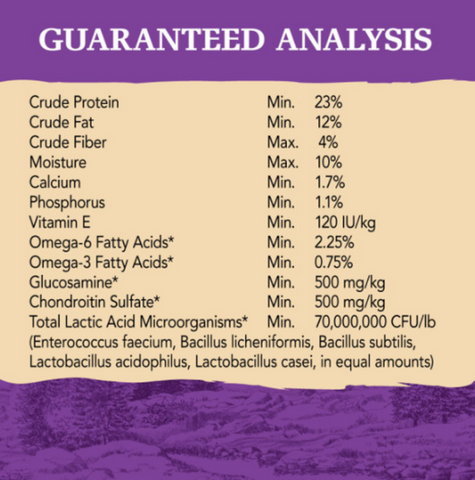 Lamb Meal, Oatmeal, Ground Brown Rice, Dehulled Barley, Chicken Fat (preserved with Mixed Tocopherols), Chicken Meal, Brewers Dried Yeast, Tomato Pomace, Anchovy and Sardine Meal, Rice, Flaxseed, Potassium Chloride, Vitamins [Vitamin E Supplement, Niacin, Vitamin A Supplement, Ascorbic Acid (Vitamin C), Thiamine Mononitrate, d-Calcium Pantothenate, Pyridoxine Hydrochloride, Riboflavin, Vitamin D3 Supplement, Biotin, Vitamin B12 Supplement, Folic Acid], Minerals [Zinc Proteinate, Zinc Sulfate, Iron Proteinate, Ferrous Sulfate, Copper Sulfate, Copper Proteinate, Manganese Proteinate, Manganese Sulfate, Sodium Selenite, Calcium Iodate], Taurine, Calcium Carbonate, Mixed Tocopherols added to preserve freshness, Inulin, Glucosamine Hydrochloride, Dried Enterococcus faecium Fermentation Product, Dried Bacillus licheniformis Fermentation Product, Dried Bacillus subtilis Fermentation Product, Dried Aspergillus oryzae Fermentation Product, Dried Trichoderma reesei Fermentation Product, Dried Rhizopus oryzae Fermentation Product, Dried Lactobacillus acidophilus Fermentation Product, Dried Lactobacillus casei Fermentation Product, Rosemary Extract, Green Tea Extract.