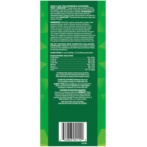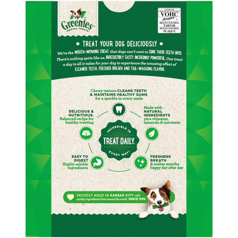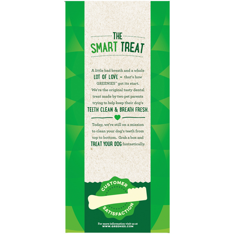 One GREENIES Original Dental Treat a day is all it takes for clean teeth, fresh breath and a happy dog. Your dog can't wait to sink their teeth into these delicious, original-flavor dental dog chews because they feature a delightfully chewy texture that fights plaque and tartar. Irresistibly tasty and incredibly powerful, GREENIES Treats for Dogs are recommended by veterinarians for at-home oral care. Best of all, these natural dog treats are made with highly soluble ingredients that are safe and easy to digest. Give your dog the mouth-wowing treat that helps promote their overall health with GREENIES Dog Treats. Natural Dog Treats Plus Vitamins, Minerals and Other Nutrients.