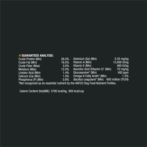 : Chicken, rice, whole grain wheat, poultry by-product meal (source of glucosamine),soybean meal, beef fat preserved with mixed-tocopherols, corn gluten meal, whole grain corn, dried eggproduct, fish meal (source of glucosamine), natural flavor, glycerin, wheat bran, calcium carbonate, monoand dicalcium phosphate, salt, soybean oil, potassium chloride, fish oil, MINERALS [zinc proteinate,manganese proteinate, ferrous sulfate, copper proteinate, calcium iodate, sodium selenite], VITAMINS[Vitamin E supplement, niacin (Vitamin B-3), Vitamin A supplement, calcium pantothenate (Vitamin B-5),thiamine mononitrate (Vitamin B-1), Vitamin B-12 supplement, riboflavin supplement (Vitamin B-2),pyridoxine hydrochloride (Vitamin B-6), folic acid (Vitamin B-9), Vitamin D-3 supplement, menadionesodium bisulfite complex (Vitamin K), biotin (Vitamin B-7)], choline chloride, L-ascorbyl-2-polyphosphate(Vitamin C), dried Bacillus coagulans fermentation product, L-Lysine monohydrochloride, garlic oil.