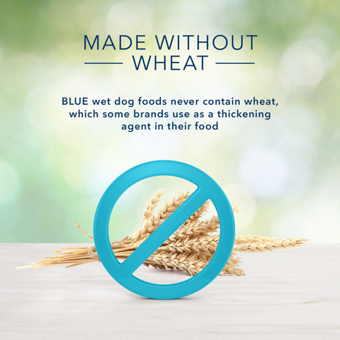 - MADE WITHOUT WHEAT: Unlike many other dog food brands, BLUE never uses wheat as a thickener in our wet dog food. There are also NO chicken (or poultry) by-product meals, and NO corn, soy, artificial flavors or preservatives
