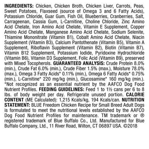 If your dog doesn’t do well with grains, switch to BLUE Freedom® grain free wet dog food. Made from the finest natural ingredients enhanced with vitamins and minerals, this mouthwatering recipe starts with high-quality chicken and is packed with healthy fruits and vegetables. Plus, unlike many other wet dog foods, it’s made without wheat as a thickener.Formulated with quality protein and carbohydrates, this wholesome recipe helps support your small breed dog’s higher energy needs.