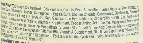 Chicken,Chicken Broth, Chicken Liver, Carrots, Peas,Brown Rice,Barley,Oatmeal,Sweet Potatoes,Guar Gum, Potassium Chloride,Carrageenan,Cassia Gum,Salt,Flaxseed, Cranberries,Blueberries,Choline Chloride,Zinc Amino Acid Chelate,Iron Amino Acid Chelate,Vitamin E Supplement,Copper Amino Acid Chelate,Manganese Amino Acid Chelate,Sodium Selenite,Thiamine Mononitrate (Vitamin B1),Cobalt Amino Acid Chelate,Niacin Supplement (Vitamin B3),Calcium Pantothenate (Vitamin B5),Vitamin A Supplement,Riboflavin Supplement (Vitamin B2),Biotin (Vitamin B7),Vitamin B12 Supplement,Potassium Iodide,Pyridoxine Hydrochloride (Vitamin B6),Vitamin D3 Supplement,Folic Acid (Vitamin B9)Guaranteed Analysis
