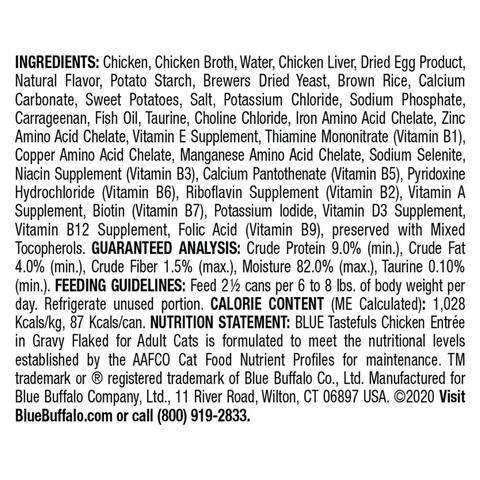 - DELICIOUS CHICKEN FIRST: The first ingredient in this BLUE Tastefuls cat food recipe is protein-rich chicken to support healthy muscle maintenance ; SAVORY FLAKED ENTRÉE: Tastefuls flaked wet cat food in savory gravy is so flavorful even finicky felines will come back for more. One taste is all it takes!