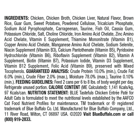 Chicken, Chicken Broth, Chicken Liver, Natural Flavor, Brown Rice, Guar Gum, Sweet Potatoes, Powdered Cellulose, Tricalcium Phosphate, Sodium Acid Pyrophosphate, Carrageenan, Taurine, Fish Oil, Cassia Gum, Potassium Chloride, Salt, Choline Chloride, Iron Amino Acid Chelate, Zinc Amino Acid Chelate, Vitamin E Supplement, Thiamine Mononitrate (Vitamin B1), Copper Amino Acid Chelate, Manganese Amino Acid Chelate, Sodium Selenite, Niacin Supplement (Vitamin B3), Calcium Pantothenate (Vitamin B5), Pyridoxine Hydrochloride (Vitamin B6), Riboflavin Supplement (Vitamin B2), Vitamin A Supplement, Biotin (Vitamin B7), Potassium Iodide, Vitamin D3 Supplement, Vitamin B12 Supplement, Folic Acid (Vitamin B9), preserved with Mixed TocopherolsGuaranteed Analysis