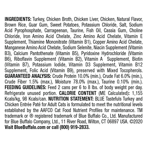• DELICIOUS TURKEY FIRST: The first ingredient in this BLUE Tastefuls cat food recipe is protein-rich turkey to support healthy muscle maintenance ; SAVORY PATÉ: Tastefuls wet cat food featuring a smooth, silky texture is so flavorful even finicky felines will come back for more. One taste is all it takes!