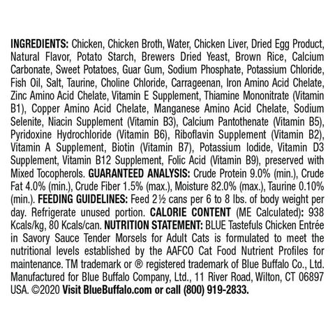 BLUE Tastefuls cat food is so delicious, your cat will keep coming back for more. This wet cat food recipe starts with mouthwatering morsels of real chicken as the first ingredient, plus brown rice and sweet potatoes in savory gravy. Made from the finest natural ingredients enhanced with vitamins, minerals and other nutrients, Tastefuls canned cat food has the great taste cats want with the healthy ingredients you prefer feeding. Let your cat try it to see why one taste is all it takes!