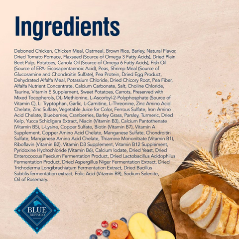 Deboned Chicken, Chicken Meal, Oatmeal, Brown Rice, Barley, Natural Flavor, Dried Tomato Pomace, Flaxseed (source of Omega 3 Fatty Acids), Dried Plain Beet Pulp, Potatoes, Canola Oil (source of Omega 6 Fatty Acids), Fish Oil (source of EPA-Eicosapentaenoic Acid), Peas, Shrimp Meal (source of Glucosamine and Chondroitin Sulfate), Pea Protein, Dried Egg Product, Dehydrated Alfalfa Meal, Potassium Chloride, Dried Chicory Root, Pea Fiber, Alfalfa Nutrient Concentrate, Calcium Carbonate, Salt, Choline Chloride, Taurine, Vitamin E Supplement, Sweet Potatoes, Carrots, preserved with Mixed Tocopherols, DL-Methionine, L-Ascorbyl-2-Polyphosphate (source of Vitamin C), L-Tryptophan, Garlic, L-Carnitine, L-Threonine, Zinc Amino Acid Chelate, Zinc Sulfate, Vegetable Juice for color, Ferrous Sulfate, Iron Amino Acid Chelate, Blueberries, Cranberries, Barley Grass, Parsley, Turmeric, Dried Kelp, Yucca Schidigera Extract, Niacin (Vitamin B3), Calcium Pantothenate (Vitamin B5), L-Lysine, Copper Sulfate, Biotin (Vitamin B7), Vitamin A Supplement, Copper Amino Acid Chelate, Manganese Sulfate, Chondroitin Sulfate, Manganese Amino Acid Chelate, Thiamine Mononitrate (Vitamin B1), Riboflavin (Vitamin B2), Vitamin D3 Supplement, Vitamin B12 Supplement, Pyridoxine Hydrochloride (Vitamin B6), Calcium Iodate, Dried Yeast, Dried Enterococcus faecium fermentation product, Dried Lactobacillus acidophilus fermentation product, Dried Aspergillus niger fermentation extract, Dried Trichoderma longibrachiatum fermentation extract, Dried Bacillus subtilis fermentation extract, Folic Acid (Vitamin B9), Sodium Selenite, Oil of Rosemary.Guaranteed Analysis