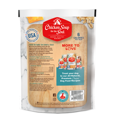 Our heart-shaped biscuits are scored for easy sharing! All-natural dog treats made with real bacon and cheese. No corn, wheat or soy. No artificial colors or flavors. No by-products. Made & sourced in the USA. 100% Guaranteed! -Real Bacon & Cheese-No by-product meals-No wheat, corn or soy-No artificial colors, preservatives or flavors-Low calorie: only 6 calories per treat-Lovingly prepared in the USA with the world’s finest ingredients