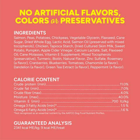 Salmon, chickpea flour, potato flour, tapioca starch, maple syrup, vegetable glycerine, carrots, apples, spinach, cherries, sweet potatoes, cranberries, natural flavor, salt, flaxseed, avocados, eggs, salmon oil, phosphoric acid, sorbic acid (as preservative), vitamin E supplement, citric acid, mixed tocopherols (as preservative), rosemary.