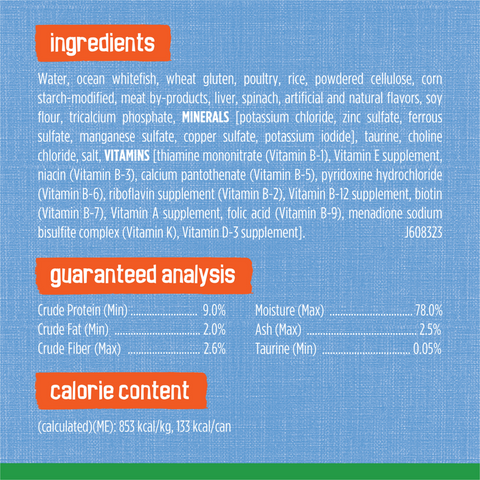 Water, Ocean Whitefish, Wheat Gluten, Poultry, Rice, Powdered Cellulose, Corn Starch-Modified, Spinach, Meat By-Products, Liver, Artificial And Natural Flavors, Soy Flour, Tricalcium Phosphate, Minerals [Potassium Chloride, Zinc Sulfate, Ferrous Sulfate, Manganese Sulfate, Copper Sulfate, Potassium Iodide], Added Color, Taurine, Choline Chloride, Salt, Vitamins [Thiamine Mononitrate (Vitamin B-1), Vitamin E Supplement, Niacin (Vitamin B-3), Calcium Pantothenate (Vitamin B-5), Vitamin A Supplement, Menadione Sodium Bisulfite Complex (Vitamin K), Pyridoxine Hydrochloride (Vitamin B-6), Riboflavin Supplement (Vitamin B-2), Vitamin B-12 Supplement, Biotin (Vitamin B-7), Folic Acid (Vitamin B-9), Vitamin D-3 Supplement], Red 3.