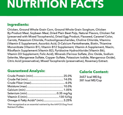 Chicken, Ground Whole Grain Corn, Ground Whole Grain Sorghum, Chicken By-Product Meal, Dried Beet Pulp, Natural Flavor, Chicken Fat (preserved with mixed Tocopherols), Dried Egg Product, Potassium Chloride, Flaxseed, Caramel Color, Salt, L-Lysine Monohydrochloride, Choline Chloride, Carrots, Tomatoes,Calcium Carbonate, Fructooligosaccharides, Spinach, Green Peas, Minerals (Ferrous Sulfate, Zinc Oxide, Sodium Selenite, Manganese Sulfate, Copper Sulfate, Manganous Oxide, Potassium Iodide), Vitamins (Vitamin E Supplement, Ascorbic Acid, Calcium Pantothenate, Vitamin A Supplement, Biotin, Thiamine Mononitrate (source of Vitamin B1), Vitamin B12 supplement, Niacin, Riboflavin Supplement (source of Vitamin B2), Inositol, Pyridoxine Hydrochloride (source of Vitamin B6), Vitamin D3 Supplement, Folic Acid), Dried Brewers Yeast, DL-Methionine, Dried Apple Pomace, L-Carnitine, Dried Blueberry Pomace, Mixed Tocopherols, Rosemary Extract.