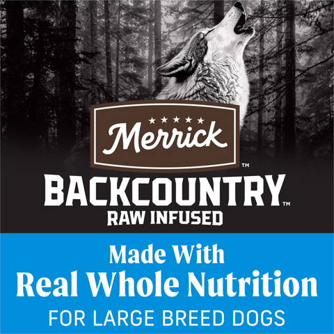 - Merrick Backcountry Grain Free Large Breed Recipe. Gluten Free Adult Dry Dog Food Kibble with Freeze Dried Raw Pieces for Large Dogs