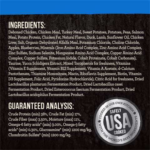Deboned Chicken, Chicken Meal, Turkey Meal, Sweet Potatoes, Peas, Potatoes, Pea Protein, Chicken Fat, Natural Flavor, Lamb, Miscanthus Grass, Dried Yeast, Flaxseed, Tapioca Starch, Chicken Livers, Potassium Chloride, Salt, Chicken Hearts, Choline Chloride, MINERALS?[Zinc Amino Acid Complex, Iron Amino Acid Complex, Sodium Selenite, Manganese Amino Acid Complex, Copper Amino Acid Complex, Calcium Iodate], Salmon Oil, DL-Methionine, Sunflower Oil, Taurine, VITAMINS [Vitamin E Supplement, Vitamin B-12 Supplement, Vitamin A Supplement, Niacin (Vitamin B-3), Thiamine Mononitrate (Vitamin B-1), Calcium Pantothenate (Vitamin B-5), Folic Acid (Vitamin B-9), Riboflavin Supplement (Vitamin B-2), Menadione Sodium Bisulfite Complex (Vitamin K), Pyridoxine Hydrochloride (Vitamin B-6), Biotin (Vitamin B-7), Vitamin D-3 Supplement], Gelatin, Mixed Tocopherols For Freshness. B277723