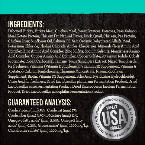 Deboned Turkey, Turkey Meal, Chicken Meal, Sweet Potatoes, Potatoes, Peas, Chicken Fat, Pea Protein, Salmon Meal, Duck, Natural Flavor, Chicken, Chicken Liver, Tapioca, Dried Yeast, Potassium Chloride, Salt, Salmon Oil, Choline Chloride, Minerals (Zinc Amino Acid Complex, Iron Amino Acid Complex, Sodium Selenite, Manganese Amino Acid Complex, Copper Amino Acid Complex, Calcium Iodate), DL-Methionine, Taurine, Vitamins (Vitamin E Supplement, Vitamin B12 Supplement, Vitamin A Supplement, Niacin, Thiamine Mononitrate, Riboflavin Supplement, D-Calcium Pantothenate, Folic Acid, Menadione Sodium Bisulfite Complex, Biotin, Pyridoxine Hydrochloride, Vitamin D3 Supplement), Mixed Tocopherols for Freshness. 2C37072