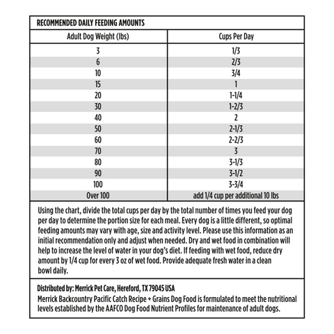 Connect your dog to an ancestral diet with Merrick Backcountry Healthy Grains, Pacific Catch Recipe. Real deboned salmon is the first ingredient in this natural, with added vitamins, minerals, and nutrients recipe, a high protein dog food that helps maintain lean muscle mass and energy levels. This real fish dog food with salmon and whitefish contains a holistic blend of kibble and freeze-dried raw pieces inspired by an ancestral canine diet and is crafted to provide the taste of raw dog food in a delicious and convenient recipe. There are easily digestible oats and wholesome ingredients included in this dry dog food with grains recipe to support a complete and balanced adult dog food. This premium dog food is made without peas or lentils and contains no artificial flavors or preservatives. Merrick Backcountry dog food recipes are proudly founded in Hereford, Texas, crafted in USA facilities.