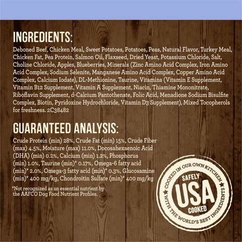 Deboned Beef, Sweet Potatoes, Peas, Lamb Meal, Potatoes, Pea Protein, Pork Fat, Natural Flavor, Salmon Meal, Potato Protein, Flaxseed, Sunflower Oil, Deboned Salmon, Salt, Organic Dehydrated Alfalfa Meal, Potassium Chloride, Choline Chloride, Apples, Blueberries, Minerals (Iron Amino Acid Complex, Zinc Amino Acid Complex, Zinc Sulfate, Sodium Selenite, Manganese Amino Acid Complex, Copper Amino Acid Complex, Copper Sulfate, Potassium Iodide, Cobalt Proteinate, Cobalt Carbonate), Taurine, Yucca Schidigera Extract, Mixed Tocopherols for Freshness, Vitamins (Vitamin E Supplement, Vitamin B12 Supplement, Vitamin A Supplement, d- Calcium Pantothenate, Thiamine Mononitre, Niacin, Riboflavin Supplement, Biotin, Vitamin D3 Supplement, Folic Acid, Pyridoxine Hydrochloride), Citric Acid for Freshness, Dried Lactobacillus plantarum Fermentation Product, Dried Lactobacillus casei Fermentation Product, Dried Enterococcus faecium Fermentation Product, Dried Lactobacillus acidophilus Fermentation Product.