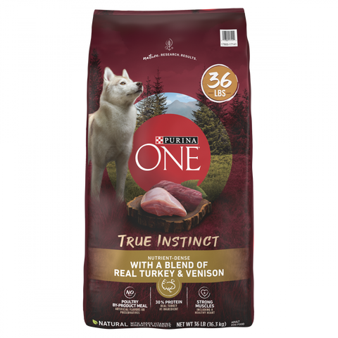 Give your dog the nutrition he needs while satisfying his true instincts when you serve Purina ONE SmartBlend True Instinct With a Natural Blend Of Real Turkey & Venison adult dry dog food. This natural pet food plus vitamins and minerals features a blend of real turkey and venison and other high-quality ingredients to provide the protein active adult dogs need and the nutrient-dense nutrition dogs crave. Crunchy kibble and double the meaty morsels compared to our Purina ONE Lamb & Rice formula help to make mealtime even more enjoyable, and the highly-digestible formula lets more nutrition go to work inside your dog. Along with 30% protein in every serving, this dog food provides a natural source of glucosamine to help support your dog's healthy joints so he can maintain his active lifestyle. Nature plus science helps provide 100% complete and balanced nutrition to support an adult dog's whole-body health, giving you a smart solution for tending to your dog's nutritional needs.Make Purina ONE SmartBlend True Instinct Natural With a Natural Blend Of Real Turkey & Venison adult dry dog food your dog's daily nutrition, and give him a nutrient-dense meal option he instinctively craves in a natural formula plus vitamins and minerals. Four antioxidant sources help support his immune system, and omega-6 fatty acids in every serving of this food for dogs support his healthy skin and radiant coat. Natural sources of glucosamine help support your dog's joint health so he can keep up with his daily adventures. With a combination of meaty morsels and crunchy bites, this dry dog food delivers the textures your dog wants in his dish. We craft this recipe without chicken by-product meal and artificial flavors or preservatives, and 0% fillers means that every high-quality ingredient has a purpose. Give Purina One SmartBlend True Instinct With a Natural Blend of Real Turkey & Venison formula to your adult dog as his daily meal, combining nature plus research to help provide him with 100% complete and balanced nutrition, and also try our wet dog foods for more variety. Making sure your dog gets the high-quality, nourishing meals he deserves is important to you, and that makes it important to us. We formulate this recipe to meet or exceed AAFCO standards for health and safety, and every batch undergoes rigorous checks for quality and safety throughout each step of the manufacturing process. We know you care about where his meals come from, which is why Purina ONE pet foods are proudly manufactured in our Purina-owned U.S. facilities. Backed by Purina's more than 90 years of innovation, Purina ONE is a brand we are proud to produce for your dog. Offer him Purina ONE SmartBlend True Instinct With a Natural Blend of Real Turkey & Venison adult dry dog food at mealtime, and give him the nourishment he needs in a formula he'll get excited about.