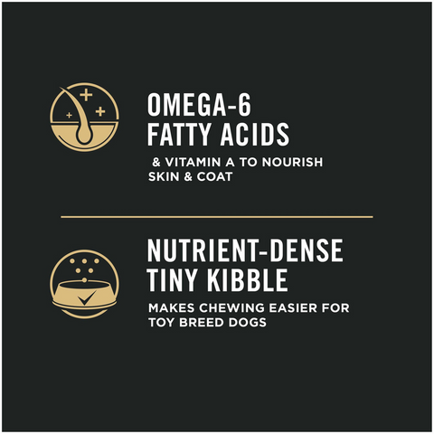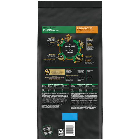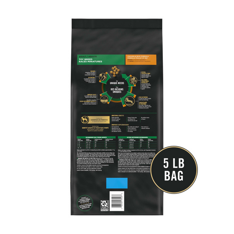 Deliver big taste and wholesome nutrition to your toy-breed dog's bowl with Purina Pro Plan Brand Dog Food Toy Breed Chicken & Rice Formula adult dry dog food. Real chicken as the first ingredient helps provide protein, which is an essential building block, while the optimal protein-to-fat ratio helps maintain an ideal body condition. Fortified with guaranteed live probiotics for digestive and immune health, this mouthwatering formula features bits of bite-sized kibble that are easy for your toy breed to chew at feeding time and a delicious flavor that keeps him coming back for more. Every ingredient in this super premium dry dog food recipe is carefully chosen for a specific nutritional or functional purpose, giving your canine companion a high-quality meal option you can both appreciate. Formulated for adult toy-breed dogs weighing under 10 pounds, this Purina Pro Plan dry dog food offers specialized nutrition for your dog's exceptional life.