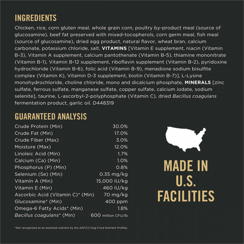 : Chicken, rice, corn gluten meal, whole grain corn, poultry by-product meal (source ofglucosamine), beef fat preserved with mixed-tocopherols, corn germ meal, fish meal (source ofglucosamine), dried egg product, natural flavor, wheat bran, calcium carbonate, potassium chloride, salt,VITAMINS [Vitamin E supplement, niacin (Vitamin B-3), Vitamin A supplement, calcium pantothenate(Vitamin B-5), thiamine mononitrate (Vitamin B-1), Vitamin B-12 supplement, riboflavin supplement(Vitamin B-2), pyridoxine hydrochloride (Vitamin B-6), folic acid (Vitamin B-9), menadione sodium bisulfitecomplex (Vitamin K), Vitamin D-3 supplement, biotin (Vitamin B-7)], L-Lysine monohydrochloride, cholinechloride, mono and dicalcium phosphate, MINERALS [zinc sulfate, ferrous sulfate, manganese sulfate,copper sulfate, calcium iodate, sodium selenite], taurine, L-ascorbyl-2-polyphosphate (Vitamin C), driedBacillus coagulans fermentation product, garlic oil.