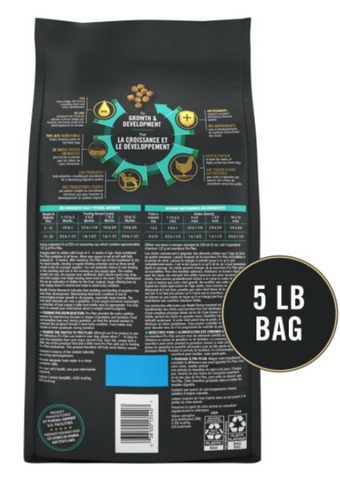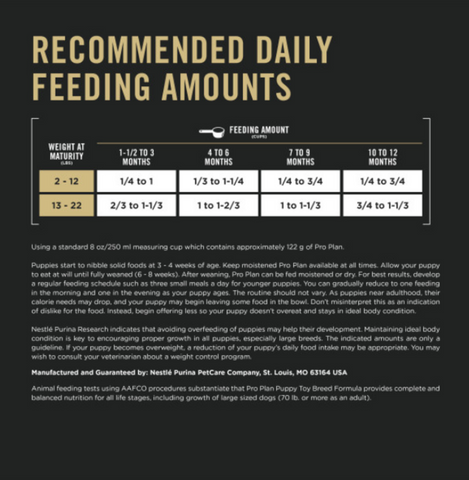 Nourish your growing toy breed puppy with Purina Pro Plan Brand Dog Food Puppy Toy Breed Chicken & Rice Formula dry puppy food. Formulated for puppies weighing under 10 pounds at maturity, this recipe helps to support his overall health and wellness through this important early life stage. High-quality protein, including real chicken as the first ingredient, provides some of the essential nutritional building blocks within your dog's body. Plus, tiny bite-sized pieces of crunchy kibble help to make chewing easier for your toy breed puppy. Including DHA from fish oil, this super-premium puppy food nourishes his brain and vision development, giving your little buddy a great start in life. The highly digestible dry formula promotes nutrient bioavailability to deliver optimal nutrient absorption so your puppy gets the most out of every bowlful.