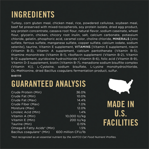 Chicken, corn gluten meal, poultry by-product meal, rice, whole grain wheat, beef fatpreserved with mixed-tocopherols, corn germ meal, dried egg product, natural flavor, fish meal, fish oil,potassium chloride, salt, calcium carbonate, soybean oil, mono and dicalcium phosphate, cholinechloride, MINERALS [zinc sulfate, ferrous sulfate, manganese sulfate, copper sulfate, calcium iodate,sodium selenite], VITAMINS [Vitamin E supplement, niacin (Vitamin B-3), Vitamin A supplement, calciumpantothenate (Vitamin B-5), thiamine mononitrate (Vitamin B-1), Vitamin B-12 supplement, riboflavinsupplement (Vitamin B-2), pyridoxine hydrochloride (Vitamin B-6), folic acid (Vitamin B-9), menadionesodium bisulfite complex (Vitamin K), Vitamin D-3 supplement, biotin (Vitamin B-7)], magnesium sulfate,DL-Methionine, dried Bacillus coagulans fermentation product, L-Lysine monohydrochloride, garlic oil.Guaranteed Analysis
