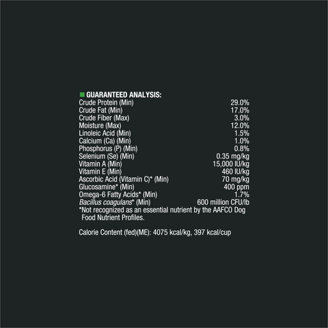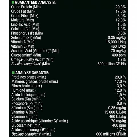 Chicken, rice, poultry by-product meal, beef fat preserved with mixed-tocopherols, corn gluten meal, soybean meal, whole grain corn, whole grain wheat, corn germ meal, dried egg product, natural flavor, dried yeast, glycerin, calcium carbonate, wheat bran, fish meal, salt, mono and dicalcium phosphate, potassium chloride, MINERALS [zinc proteinate, manganese proteinate, ferrous sulfate, copper proteinate, calcium iodate, sodium selenite], VITAMINS [Vitamin E supplement, niacin (Vitamin B3), Vitamin A supplement, calcium pantothenate (Vitamin B-5), thiamine mononitrate (Vitamin B-1), Vitamin B-12 supplement, riboflavin supplement (Vitamin B-2), pyridoxine hydrochloride (Vitamin B-6), folic acid (Vitamin B-9), Vitamin D-3 supplement, menadione sodium bisulfite complex (Vitamin K), biotin (Vitamin B-7)], choline chloride, L-Lysine monohydrochloride, L-ascorbyl-2-polyphosphate (Vitamin C), dried Bacillus coagulans fermentation product, garlic oil.