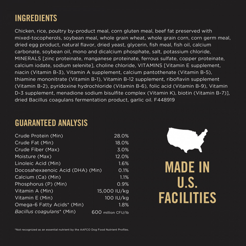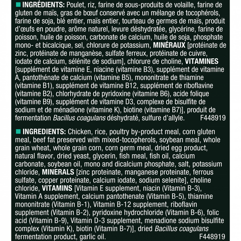 Chicken, rice, poultry by-product meal, corn gluten meal, beef fat preserved with mixedtocopherols, soybean meal, whole grain wheat, whole grain corn, corn germ meal, dried egg product,natural flavor, dried yeast, glycerin, fish meal, fish oil, calcium carbonate, soybean oil, mono anddicalcium phosphate, salt, potassium chloride, MINERALS [zinc proteinate, manganese proteinate,ferrous sulfate, copper proteinate, calcium iodate, sodium selenite], choline chloride, VITAMINS [VitaminE supplement, niacin (Vitamin B-3), Vitamin A supplement, calcium pantothenate (Vitamin B-5), thiaminemononitrate (Vitamin B-1), Vitamin B-12 supplement, riboflavin supplement (Vitamin B-2), pyridoxinehydrochloride (Vitamin B-6), folic acid (Vitamin B-9), Vitamin D-3 supplement, menadione sodium bisulfitecomplex (Vitamin K), biotin (Vitamin B-7)], dried Bacillus coagulans fermentation product, garlic oil.Guaranteed Analysis