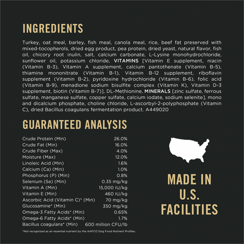 Turkey, Oat Meal, Rice, Barley, Fish Meal, Canola Meal, Beef Fat Preserved With Mixed-Tocopherols, Dried Egg Product, Pea Protein, Dried Yeast, Natural Flavor, Fish Oil, Calcium Carbonate, Dried Chicory Root, L-Lysine Monohydrochloride, Salt, Sunflower Oil, Potassium Chloride, VITAMINS [Vitamin E Supplement, Niacin (Vitamin B-3), Vitamin A Supplement, Calcium Pantothenate (Vitamin B-5), Thiamine Mononitrate (Vitamin B-1), Vitamin B-12 Supplement, Riboflavin Supplement (Vitamin B-2), Pyridoxine Hydrochloride (Vitamin B-6), Folic Acid (Vitamin B-9), Menadione Sodium Bisulfite Complex (Vitamin K), Vitamin D-3 Supplement, Biotin (Vitamin B-7)], MINERALS [Zinc Sulfate, Ferrous Sulfate, Manganese Sulfate, Copper Sulfate, Calcium Iodate, Sodium Selenite], DL-Methionine, Mono And Dicalcium Phosphate, Choline Chloride, L-Ascorbyl-2-Polyphosphate (Vitamin C). B449023