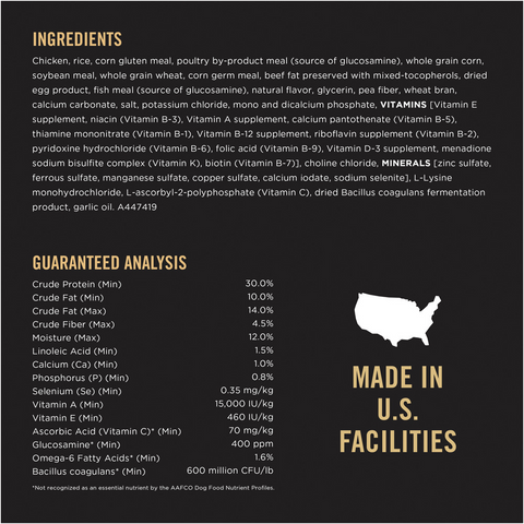 Chicken, Rice, Corn Protein Meal, Poultry By-Product Meal, Whole Grain Corn, Soybean Meal, Whole Grain Wheat, Corn Germ Meal, Beef Fat Preserved With Mixed-Tocopherols, Natural Flavor, Dried Egg Product, Fish Meal, Glycerin, Pea Fiber, Calcium Carbonate, Wheat Bran, Salt, Mono And Dicalcium Phosphate, Potassium Chloride, VITAMINS [Vitamin E Supplement, Niacin (Vitamin B-3), Vitamin A Supplement, Calcium Pantothenate (Vitamin B-5), Thiamine Mononitrate (Vitamin B-1), Vitamin B-12 Supplement, Riboflavin Supplement (Vitamin B-2), Pyridoxine Hydrochloride (Vitamin B-6), Folic Acid (Vitamin B-9), Vitamin D-3 Supplement, Menadione Sodium Bisulfite Complex (Vitamin K), Biotin (Vitamin B-7)], Choline Chloride, MINERALS [Zinc Sulfate, Ferrous Sulfate, Manganese Sulfate, Copper Sulfate, Calcium Iodate, Sodium Selenite], L-Lysine Monohydrochloride, Dried Bacillus Coagulans Fermentation Product, L-Ascorbyl-2-Polyphosphate (Vitamin C), Garlic Oil. B447423