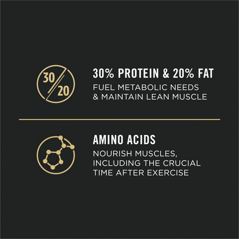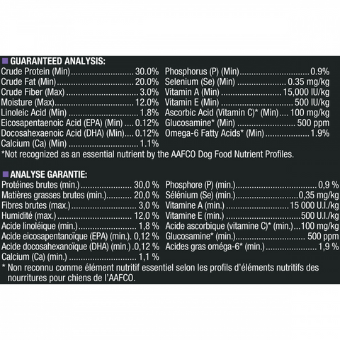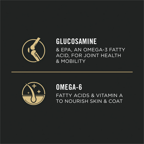 - 30% protein and 20% fat fuel metabolic needs and maintain lean muscle, while EPA, an omega-3 fatty acid, and glucosamine for dogs help support joint health and mobility