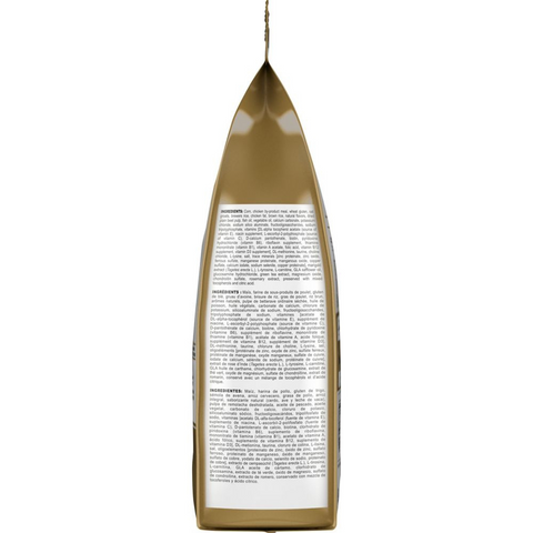 Corn, chicken by-product meal, wheat gluten, oat groats, brewers rice, chicken fat, brown rice, natural flavors, dried plain beet pulp, fish oil, vegetable oil, calcium carbonate, potassium chloride, sodium silico aluminate, fructooligosaccharides, sodium tripolyphosphate, vitamins [DL-alpha tocopherol acetate (source of vitamin E), niacin supplement, L-ascorbyl-2-polyphosphate (source of vitamin C), D-calcium pantothenate, biotin, pyridoxine hydrochloride (vitamin B6), riboflavin supplement, thiamine mononitrate (vitamin B1), vitamin A acetate, folic acid, vitamin B12 supplement, vitamin D3 supplement], DL-methionine, taurine, choline chloride, L-lysine, salt, trace minerals [zinc proteinate, zinc oxide, ferrous sulfate, manganese proteinate, manganous oxide, copper sulfate, calcium iodate, sodium selenite, copper proteinate], marigold extract (Tagetes erecta L.), L-tyrosine, L-carnitine, GLA safflower oil, glucosamine hydrochloride, green tea extract, magnesium oxide, chondroitin sulfate, rosemary extract, preserved with mixed tocopherols and citric acid.