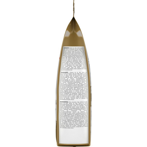 Brewers rice, wheat, chicken by-product meal, chicken fat, wheat gluten, pork meal, natural flavors, dried plain beet pulp, fish oil, vegetable oil, sodium silico aluminate, potassium chloride, salt, calcium carbonate, fructooligosaccharides, sodium tripolyphosphate, vitamins [DL-alpha tocopherol acetate (source of vitamin E), niacin supplement, L-ascorbyl-2-polyphosphate (source of vitamin C), D-calcium pantothenate, biotin, pyridoxine hydrochloride (vitamin B6), riboflavin supplement, thiamine mononitrate (vitamin B1), vitamin A acetate, folic acid, vitamin B12 supplement, vitamin D3 supplement], choline chloride, L-tyrosine, glucosamine hydrochloride, marigold extract (Tagetes erecta L.), taurine, DL-methionine, trace minerals [zinc proteinate, zinc oxide, ferrous sulfate, manganese proteinate, manganous oxide, copper sulfate, calcium iodate, sodium selenite, copper proteinate], L-lysine, magnesium oxide, green tea extract, L-carnitine, chondroitin sulfate, rosemary extract, preserved with mixed tocopherols and citric acid.