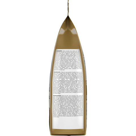 Chicken by-product meal, brewers rice, corn, chicken fat, corn gluten meal, dried plain beet pulp, wheat gluten, natural flavors, fish oil, vegetable oil, sodium silico aluminate, monocalcium phosphate, potassium chloride, calcium carbonate, fructooligosaccharides, sodium tripolyphosphate, vitamins [DL-alpha tocopherol acetate (source of vitamin E), niacin supplement, L-ascorbyl-2-polyphosphate (source of vitamin C), D-calcium pantothenate, biotin, pyridoxine hydrochloride (vitamin B6), riboflavin supplement, thiamine mononitrate (vitamin B1), vitamin A acetate, folic acid, vitamin B12 supplement, vitamin D3 supplement], salt, hydrolyzed yeast (source of betaglucans), L-lysine, DL-methionine, L-tyrosine, choline chloride, taurine, trace minerals [zinc proteinate, zinc oxide, manganese proteinate, ferrous sulfate, manganous oxide, copper sulfate, calcium iodate, sodium selenite, copper proteinate], marigold extract (Tagetes erecta L.), Yucca schidigera extract, L-carnitine, carotene, rosemary extract, preserved with mixed tocopherols and citric acid.